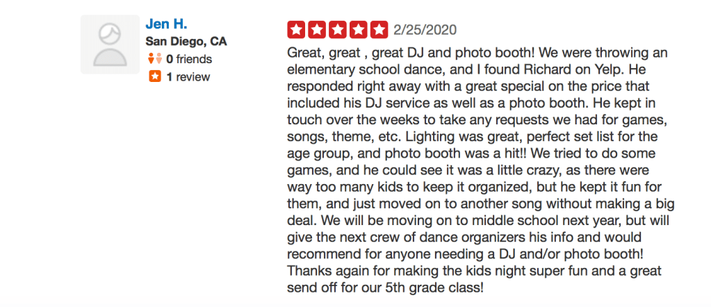 Great, great , great DJ and photo booth! We were throwing an elementary school dance, and I found Richard on Yelp. He responded right away with a great special on the price that included his DJ service as well as a photo booth. He kept in touch over the weeks to take any requests we had for games, songs, theme, etc. Lighting was great, perfect set list for the age group, and photo booth was a hit!! We tried to do some games, and he could see it was a little crazy, as there were way too many kids to keep it organized, but he kept it fun for them, and just moved on to another song without making a big deal. We will be moving on to middle school next year, but will give the next crew of dance organizers his info and would recommend for anyone needing a DJ and/or photo booth! Thanks again for making the kids night super fun and a great send off for our 5th grade class!